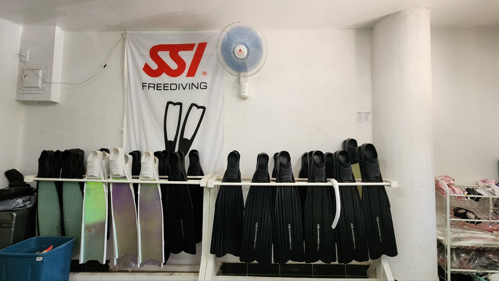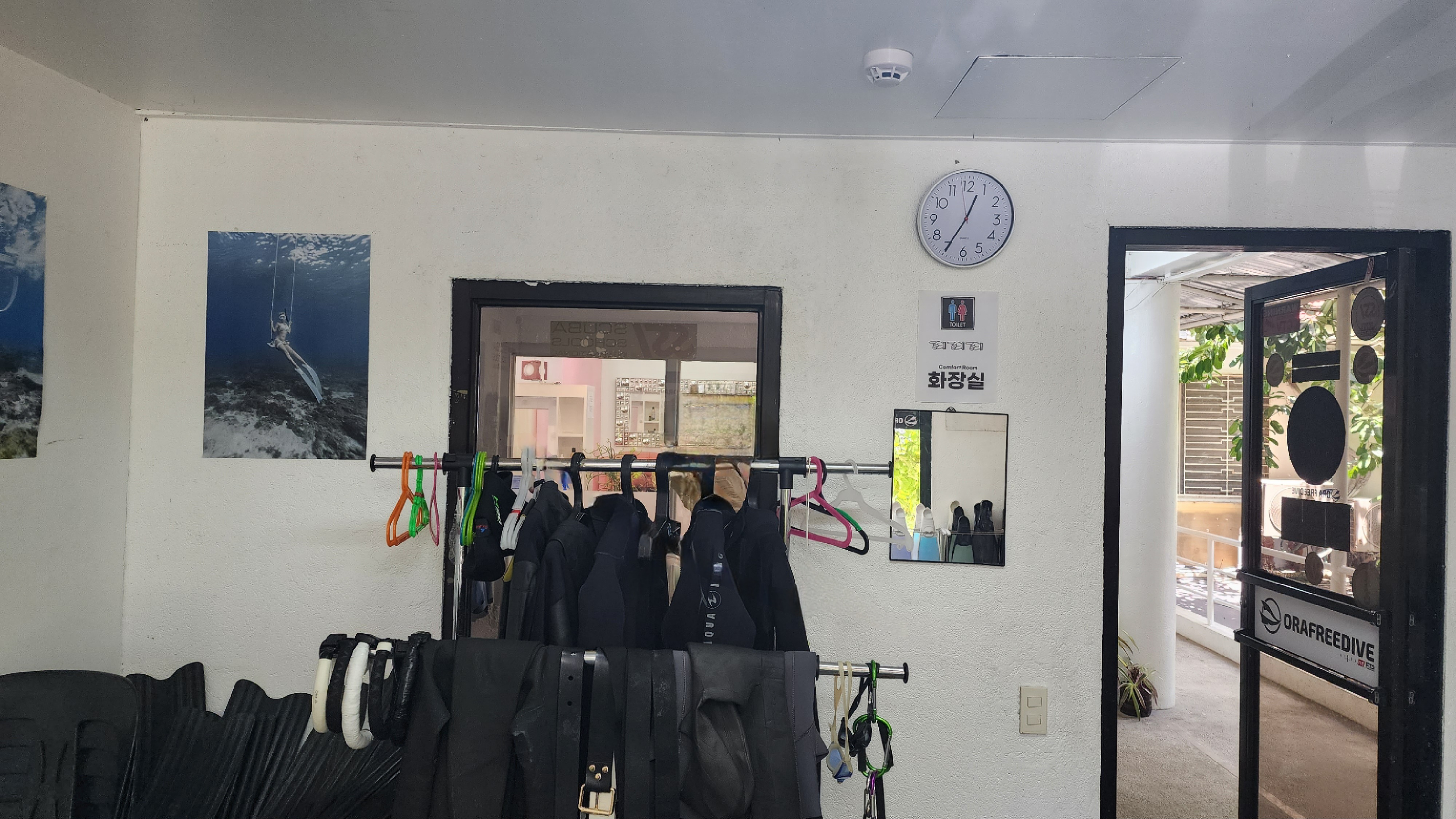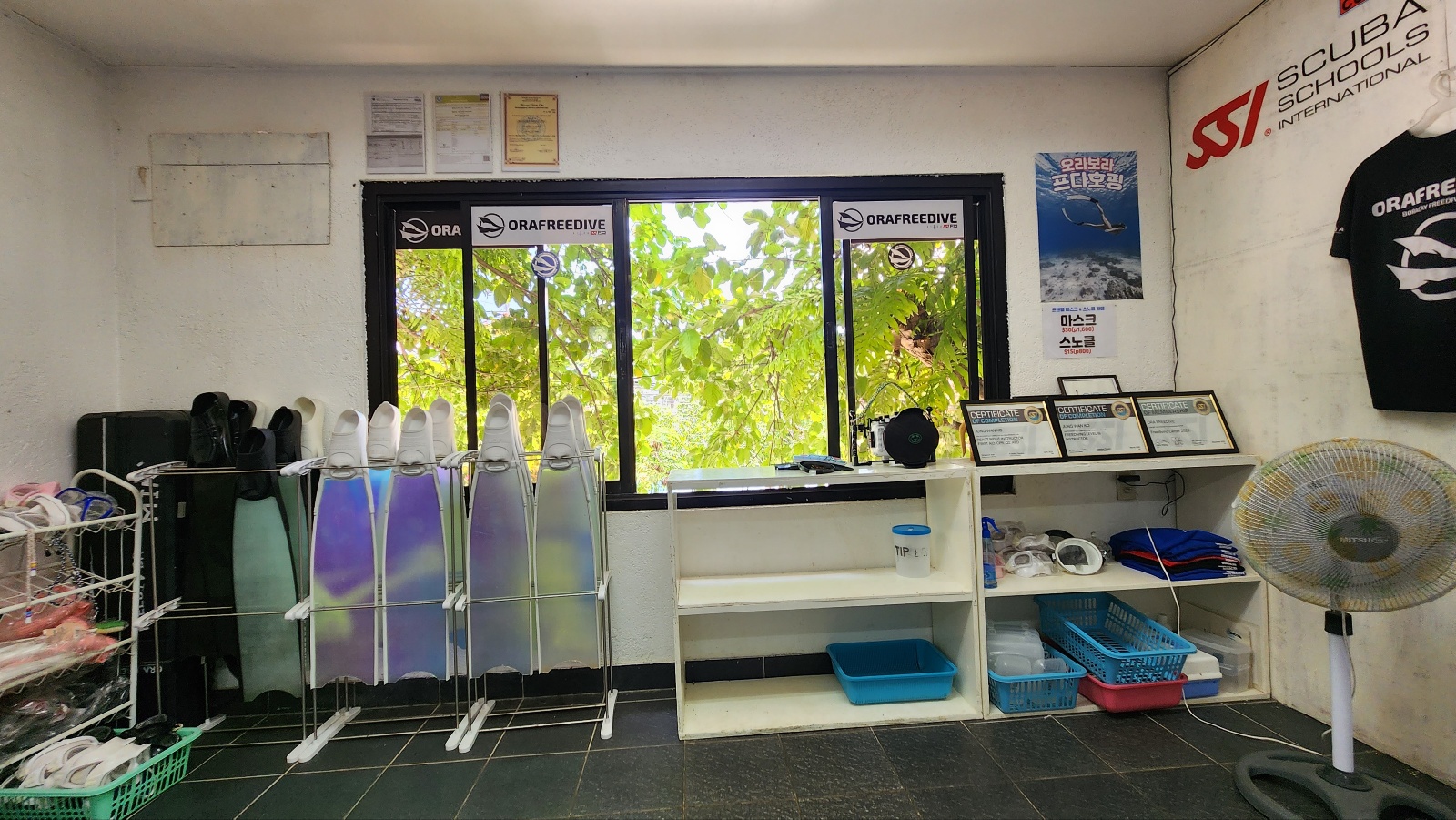 사무실에 들어가면 의자와 함께 이렇게 다이빙 장비들과 강사님 다이빙 자격증 등이 있습니다